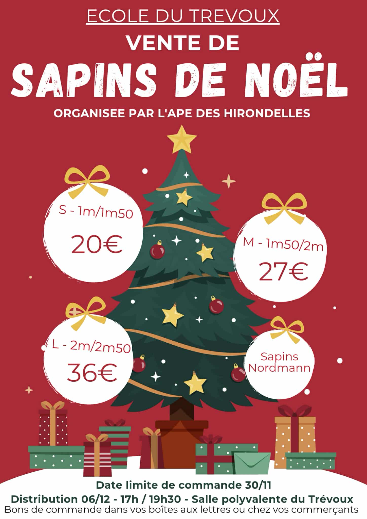Vente de sapins de Noël Par l'APE de l'école des Hirondelles. 3 tailles disponibles. Bons de commande dans vos boîtes aux lettres ou chez vos commerçants. Date limite de commande [...]