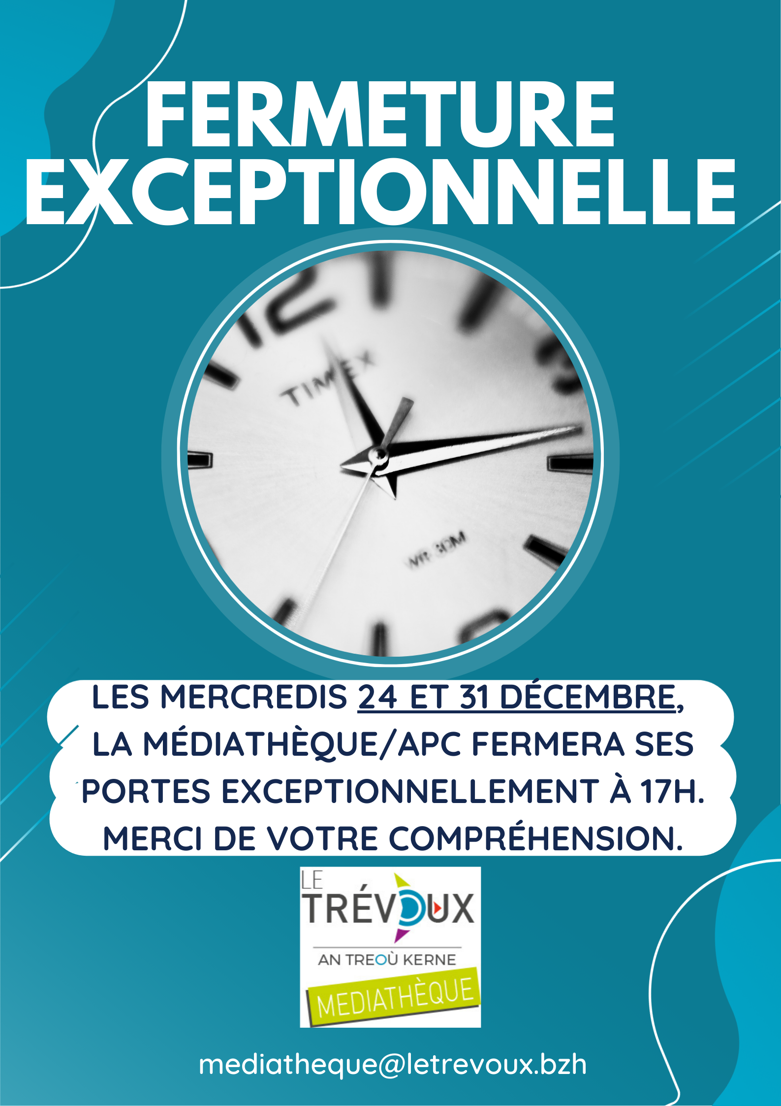 Fermetures exceptionnelles de la médiathèque/APC fin décembre La médiathèque et l’Agence postale communale fermeront leurs portes plus tôt (17h) les mercredis 24 et 31 décembre. mairie2025-12-10T10:21:31+01:0010 décembre 2025|Non classé|