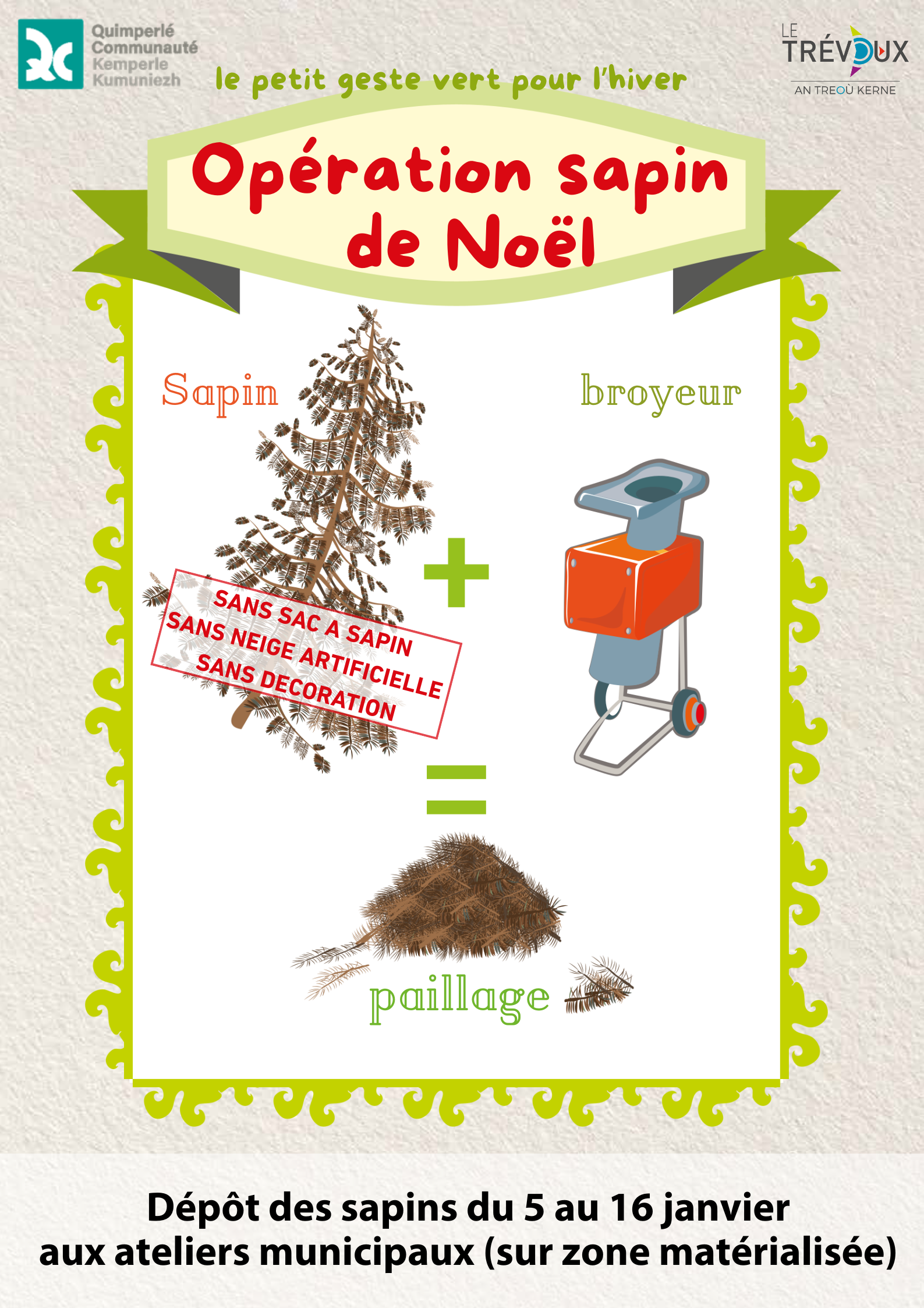 Opération broyage de sapins Vous souhaitez donner une 2e vie à votre sapin de noël ? Venez le déposer aux ateliers municipaux du 5 au 16 janvier. Il servira de paillage pour nos espaces verts En partenariat avec Quimperlé Communauté (plus d’infos ici). mairie2025-12-30T15:51:17+01:0030 décembre 2025|Non classé|