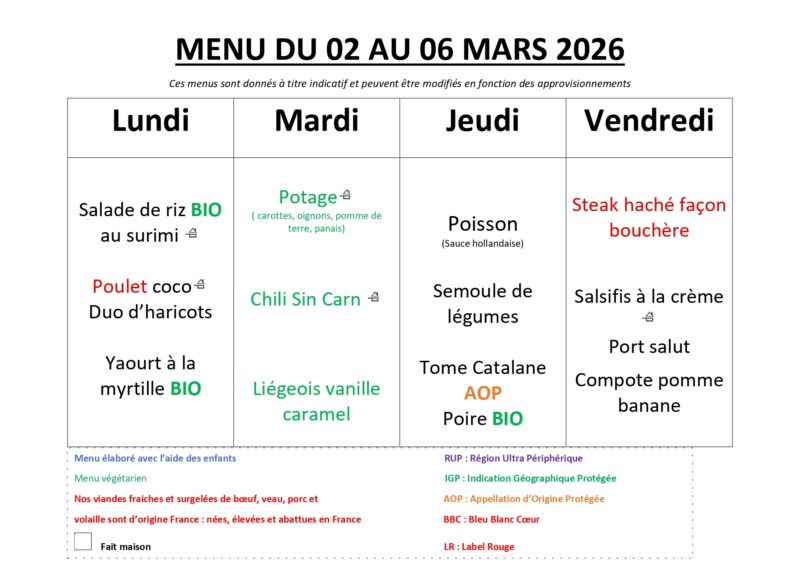 Les menus sont susceptibles d’être remplacés ou décalés certains jours selon les circonstances techniques, logistiques ou d’approvisionnement.